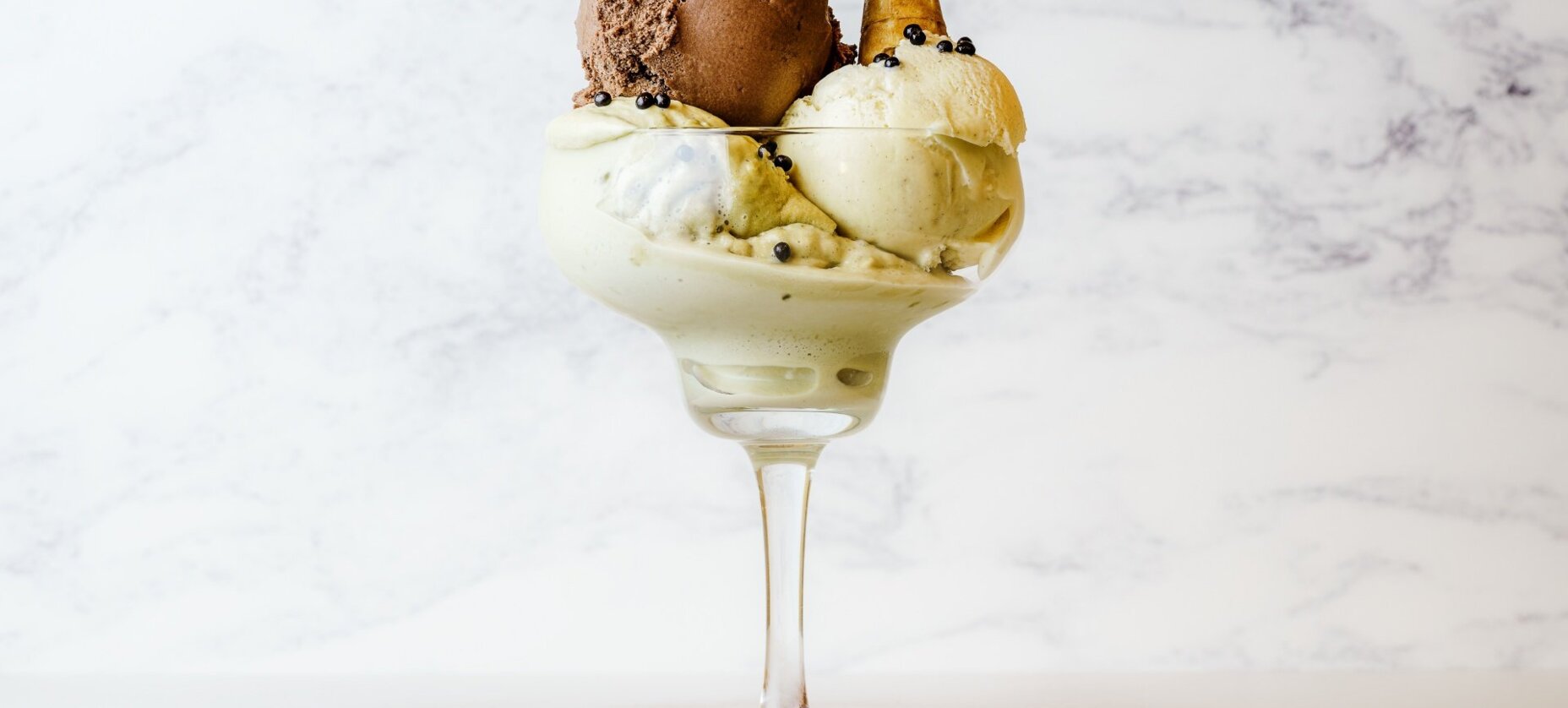 Lody caffé latte 3 gałki, migdały, biszkopty, bita śmietana, sos kawowy